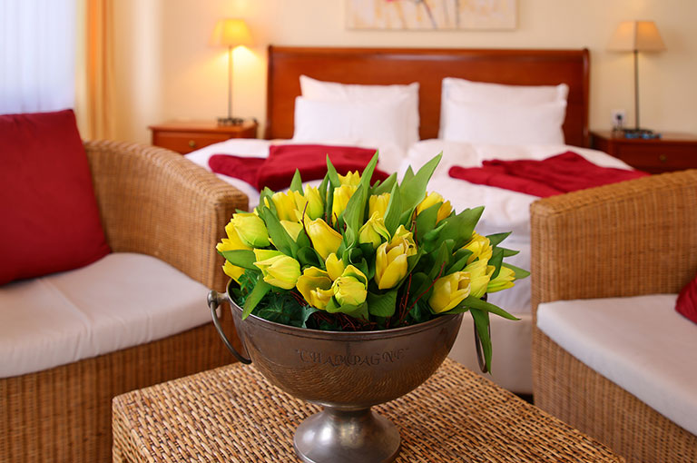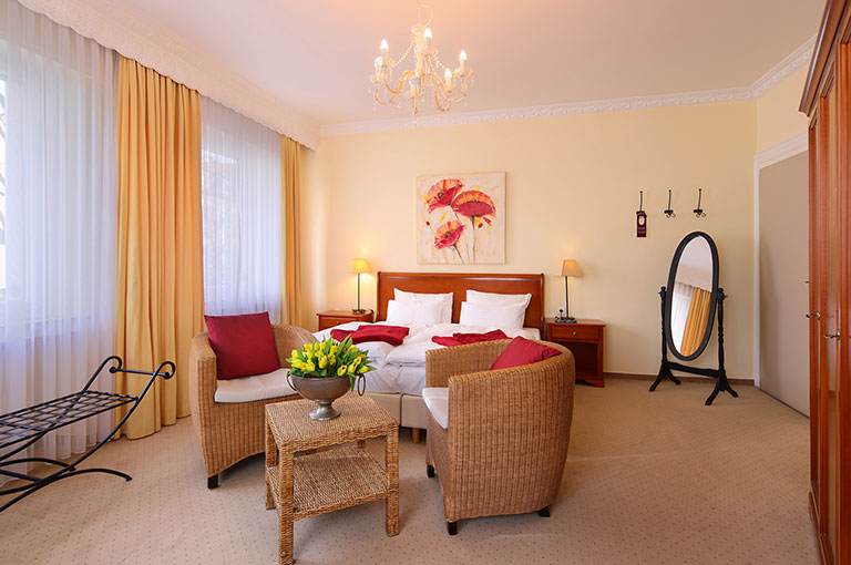 Für eine erholsame Nacht sorgen die komfortablen Boxspringbetten, die auf Wunsch auch getrennt gestellt werden können. Allergikergeeignete Bettwäsche und Bettdecken in Übergröße runden das Wohlfühlpaket ab – für Schlaf, der wirklich regeneriert.