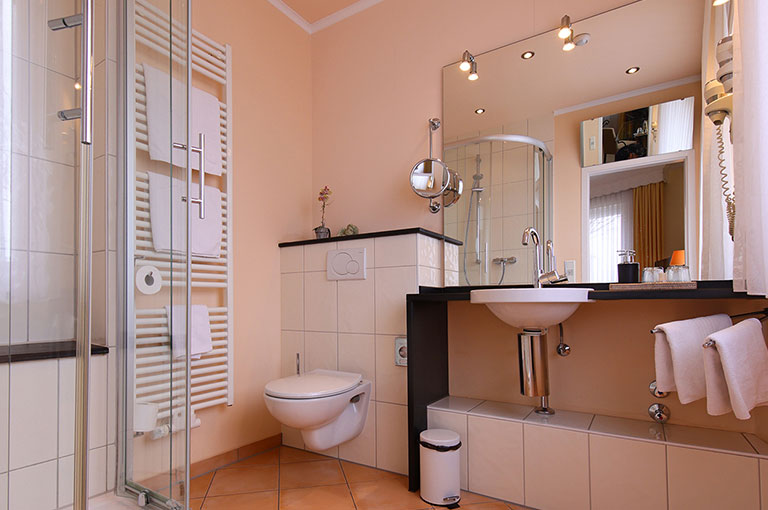 Das komfortable Duschbad ist hochwertig ausgestattet und bietet Kosmetikspiegel, Fön und ein integriertes Badradio. So starten Sie frisch, entspannt und bestens gelaunt in einen ereignisreichen Tag.