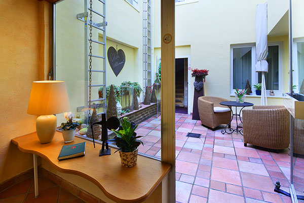 An warmen Tagen wird das Frühstück zum kleinen Urlaubsgefühl: Dann laden wir Sie ein, auf unserem idyllischen Patio Platz zu nehmen. Im sonnengelben Innenhof genießen Sie in entspannter Atmosphäre – ruhig, charmant und einfach schön.